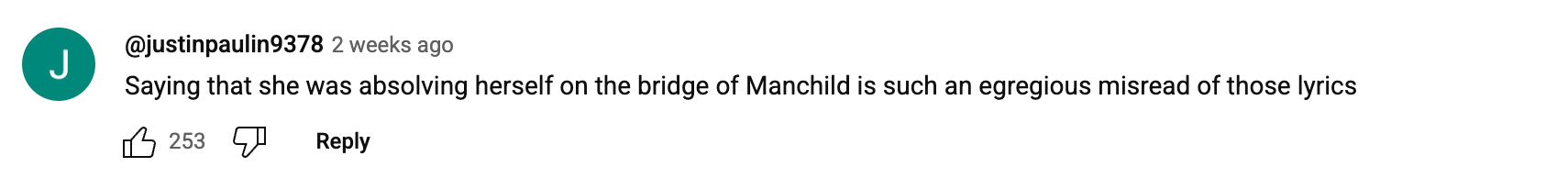 El momento en que el vídeo dejó de tener sentido para mí fue cuando Anthony (así se llama TheNeedleDrop), hablando de Manchild —la primera canción del disco—, dice al respecto de esta broma autocrítica tan evidente: