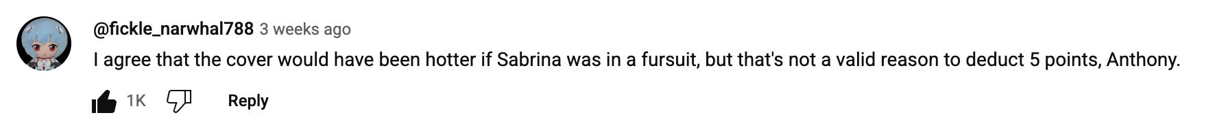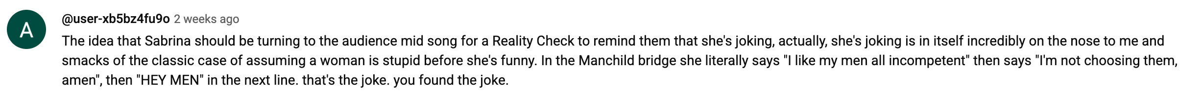 “You seemingly have Sabrina here unironically singing that her panties get so wet they become a waterfall over her partner doing what is essentially the bare minimum. And nowhere in this song does she acknowledge just how depressingly low these standards that are being set are”.